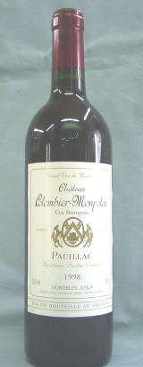 コロンビエ・モンプルー 98 <赤> (フランス産) ポーイヤックの丘、CH.ムートン・ ロートシルトの隣にあるシャトー。 1932年にクリュ・ブルジョワ・ シュペリュールに格付けされる。 作付け面積は25ha、平均樹齢は34年。 現所有者のベルナール・ジュグラ氏が 1970年に買い取ったぶどう園は、 醸造法と育成は申し分なく伝統的である。 良くバランスのとれたチョコレート香が するリッチな仕上がりである。 メドックの伝統的醸造法を用い、 樽熟成したワインは、抜栓後から よくバランスが整っています。 ただ、チョコレート香がするまでには 時間がかかります。 抜栓翌日、再びコルクを開けて 30〜40分経てばチョコレートの 香りに甘味も含んできます。 <セパージュ> カベルネ・ソーヴィニヨン65%、 メルロ25% カベルネ・フラン5%、 プティ・ヴェルド5% 750ml 3,000円 |